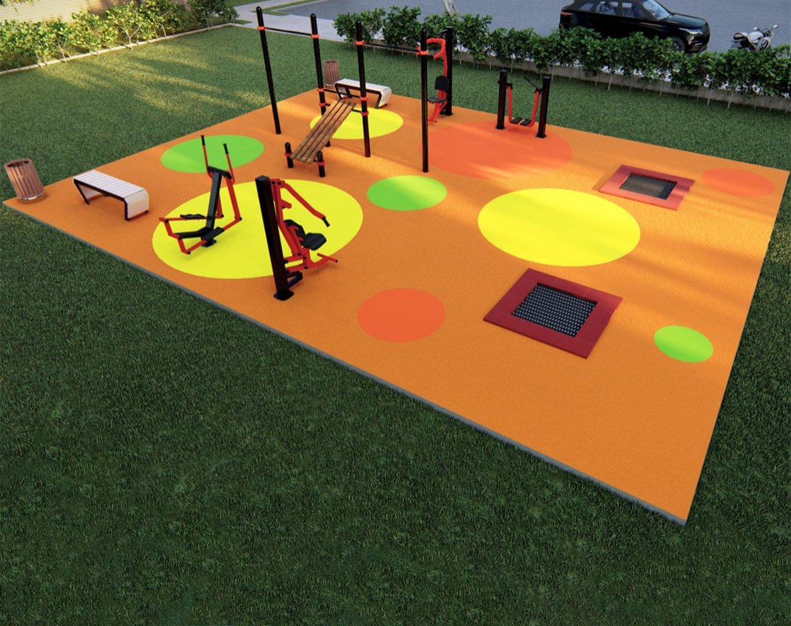 - Один воркаут 14 «Красный» (89). Размеры воркаута — 4,24х1,5х2,6 метра. Зона безопасности для него — 7,24x4,5 метра. Для различных упражнений на силу и выносливость.