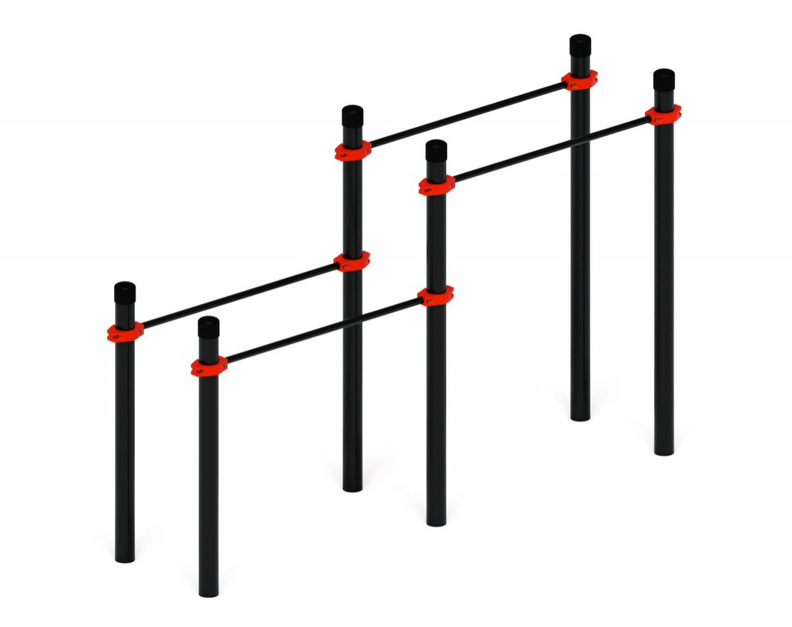 Комплекс для занятий на улице состоит из шести опорных столбов, которые обеспечивают его устойчивость и безопасность. Четыре столба имеют высоту 1500 миллиметров, а два других — 1000