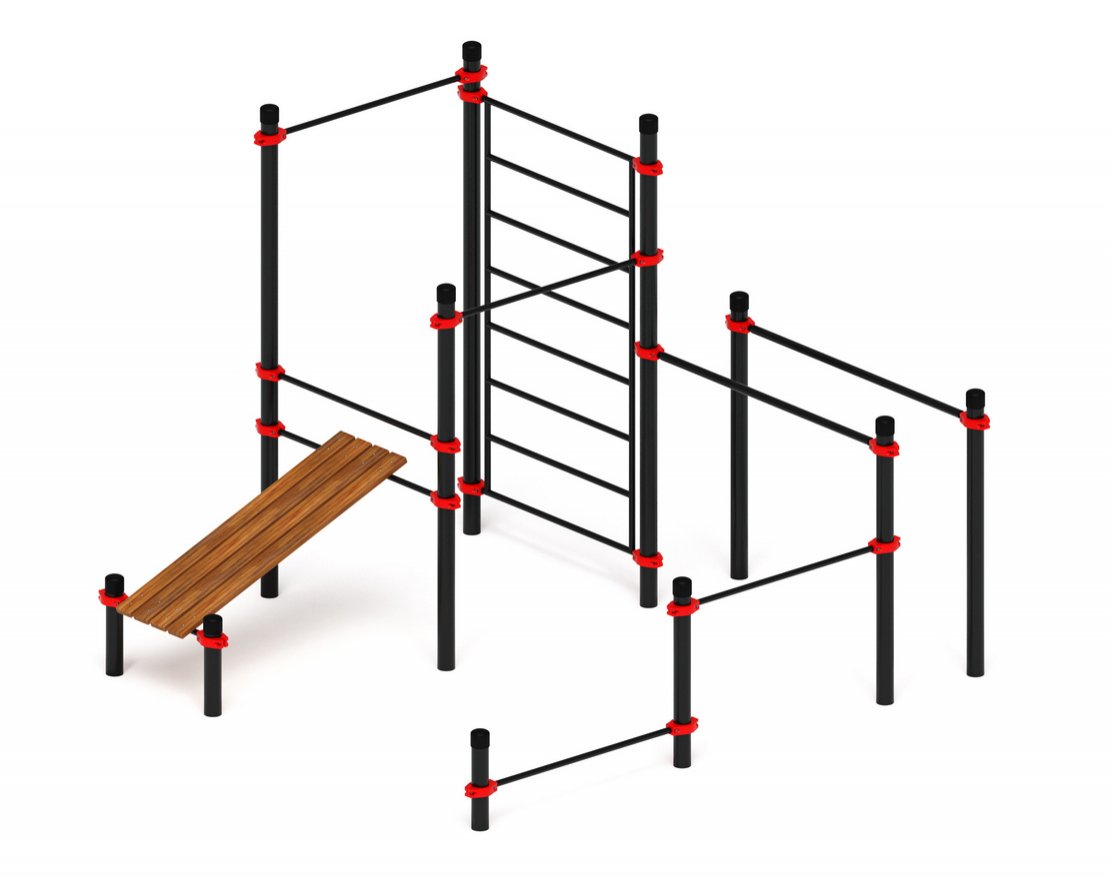 Комплекс представляет собой набор из опорных столбов, расположенных на определённой высоте. Комплекс включает в себя несколько элементов, таких как шведская стенка, перекладины, три перекладины для выполнения отжиманий и лавка для упражнений на пресс.