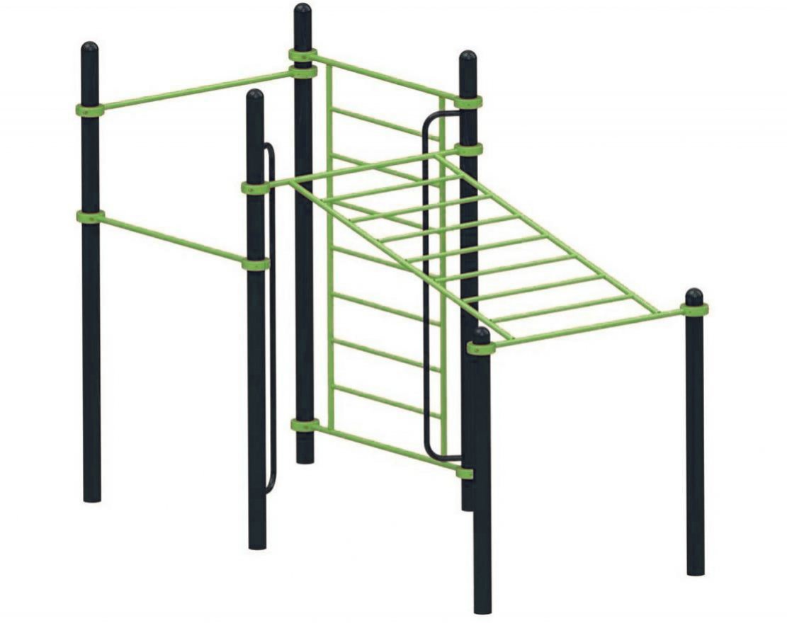 Тренажёры изготовлены из прочной стали и прослужат долгое время. Все детали регулируются хомутами по высоте. Порошковая краска, которой покрыт комплекс, устойчива к повреждениям и воздействию погодных условий. Благодаря широкой палитре цветов, комплекс может вписаться в любой дизайн загородного дома, дачи, школы или дворовой территории.