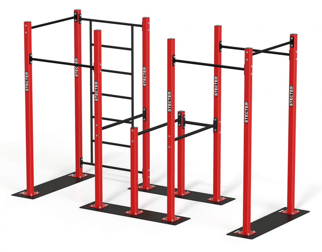 Спортивный комплекс представляет собой сборную конструкцию, которая состоит из металлических элементов. Комплекс включает восемь опорных столбов, пять перекладин и три поручня. Перекладины и поручни образуют брусья. Высота перекладин регулируется с помощью дополнительных отверстий в опорных стойках.