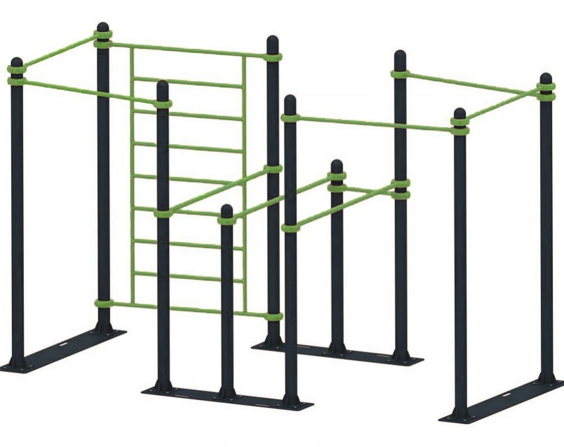 Комплекс состоит из разноуровневых турников, гимнастической стенки и параллельных брусьев. Благодаря хомутовой конструкции, элементы комплекса могут быть легко отрегулированы по высоте, что обеспечивает комфорт для пользователей с разными физическими возможностями. Это делает комплекс подходящим для занятий физической культурой и спортом для людей всех возрастов.
