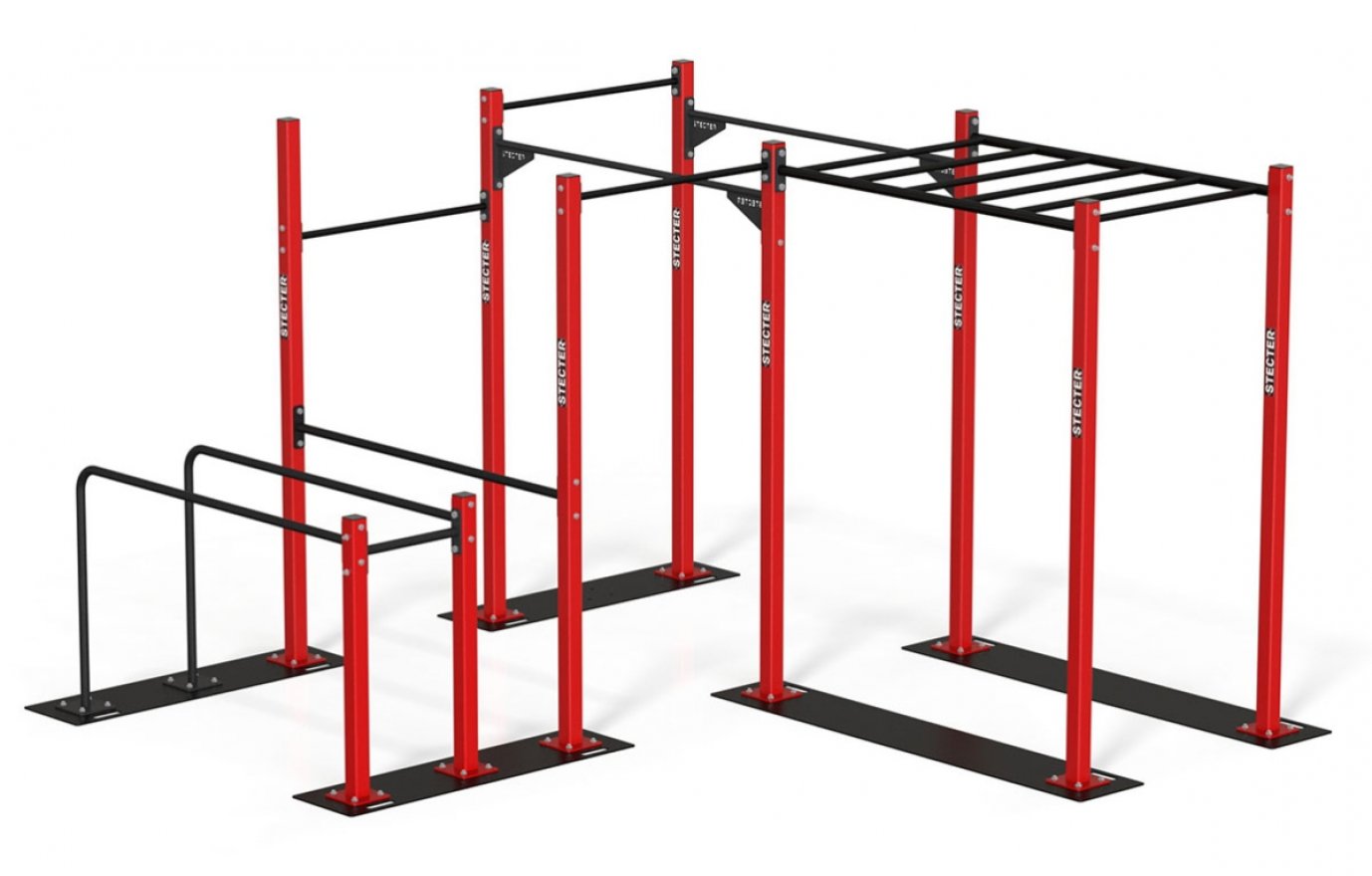 Спортивный комплекс представляет собой сборную конструкцию, состоящую из металлических элементов. Комплекс включает в себя опорные столбы, перекладины разной длины, рукоход и брусья, что позволяет выполнять разнообразные упражнения на развитие силы и выносливости.