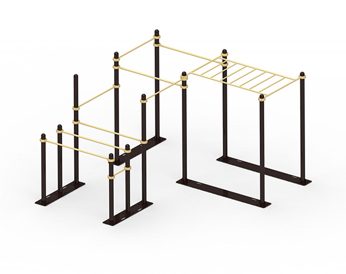 Комплекс состоит из разновысотных турников, брусьев и рукохода.