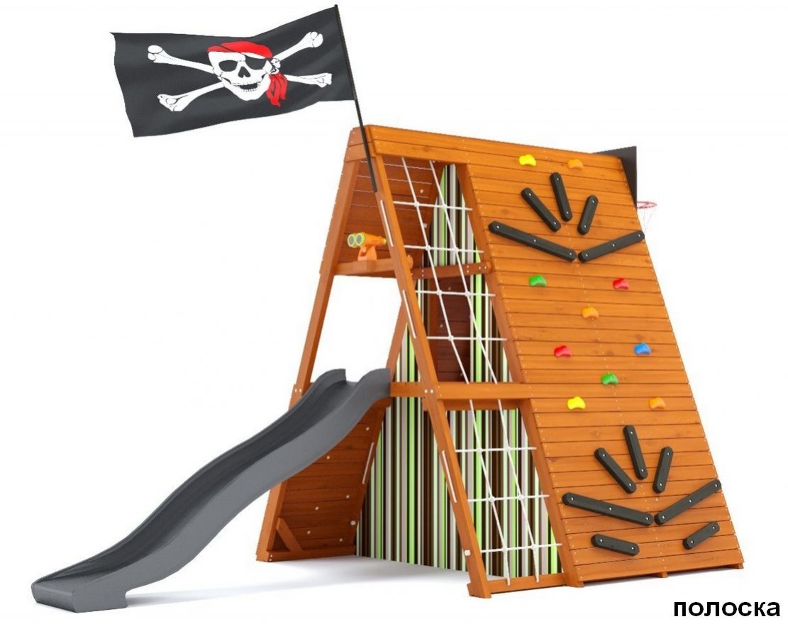 1. Разноуровневый скалодром с пластиковыми и деревянными зацепками, который способствует развитию ловкости и координации движений.