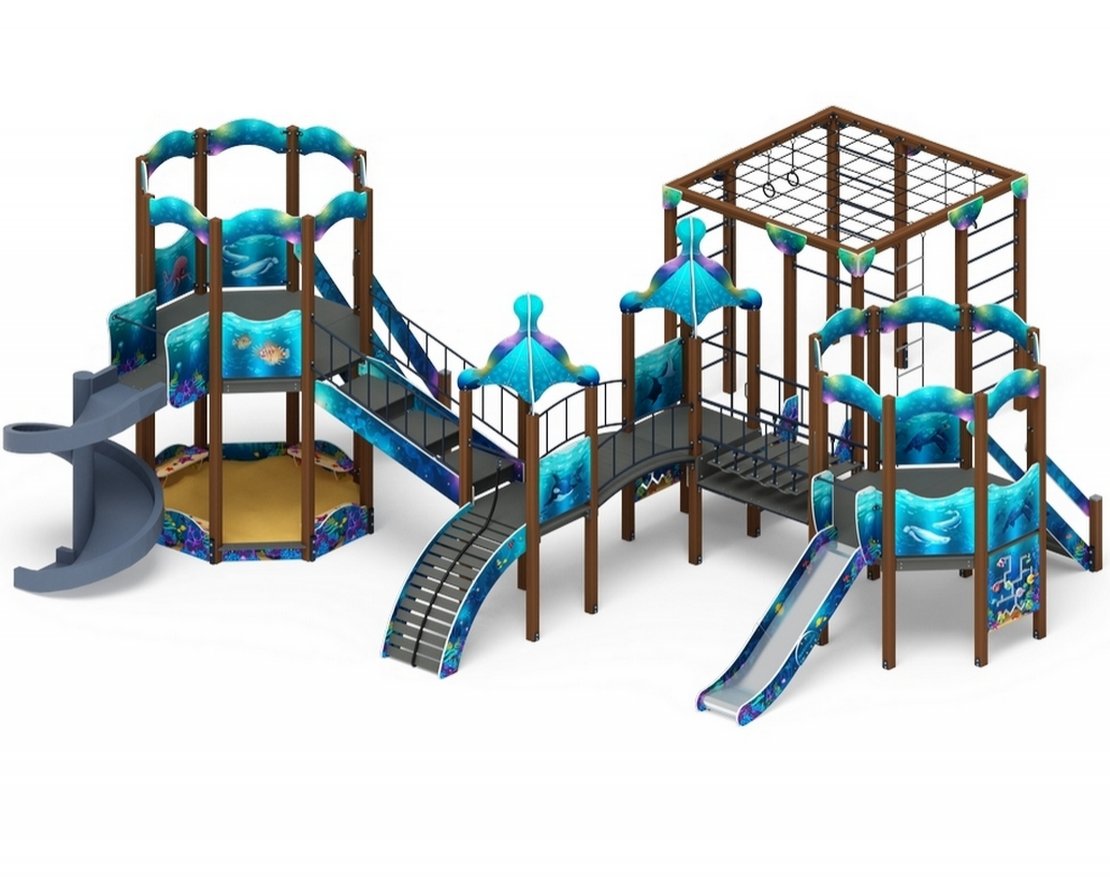Игровой комплекс включает в себя четыре башни и две горки. Горки имеют высоту 1200 и 2000.
