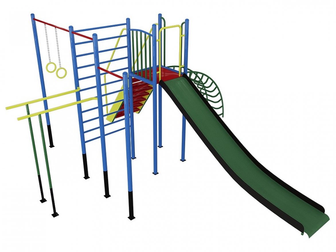 Комплекс дополнен качелями, лазалками, гимнастическими снарядами и горкой.
