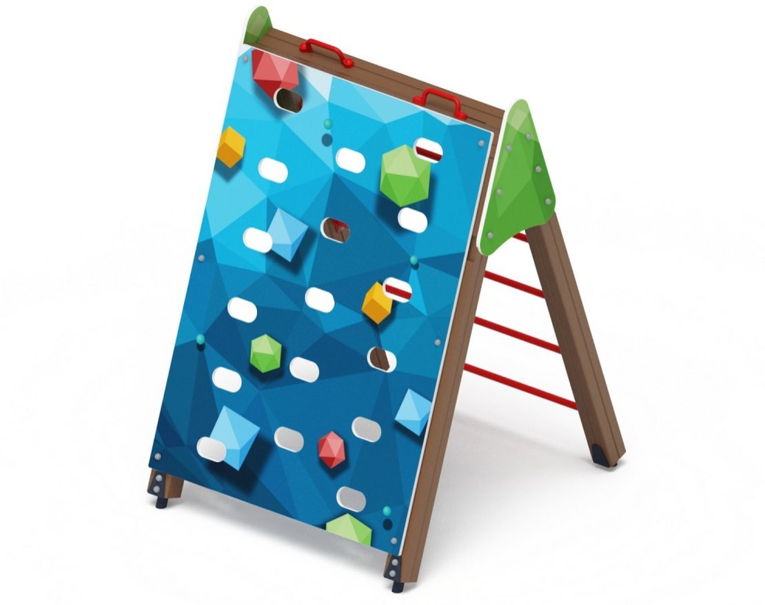 Скалолаз состоит из щита из влагостойкой фанеры, толщиной 18 мм, размер 1200х1820, с прорезями, окрашен в зеленый цвет.