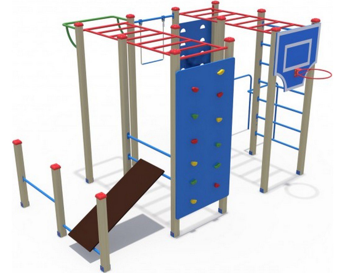 • В комплект входит: брусья, турник, гимнастическая трапеция, шведская стенка, рукоход, баскетбольное кольцо, скалодром, скамья для пресса