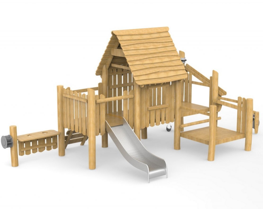Комплекс состоит из опор, горки и других элементов, изготовленных из качественных материалов. Опоры выполнены из брёвен хвойных пород, скат горки — из нержавеющей стали. Фурнитура — оцинкованная, с пластиковыми заглушками.