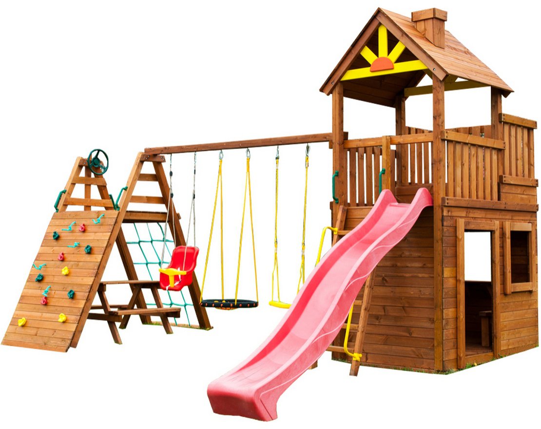 Детский городок «Крепость» — это популярная модель, которая включает в себя башню, домик, качели и дополнительные элементы. Этот городок идеально подходит для четырёх детей, как для мальчиков, так и для девочек. Он изготовлен из надёжного материала — архангельской сосны с высокой плотностью.