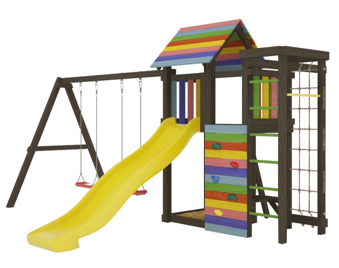 4. Разнообразие элементов. Площадка включает в себя множество игровых элементов, таких как горка, башня, качели и другие.