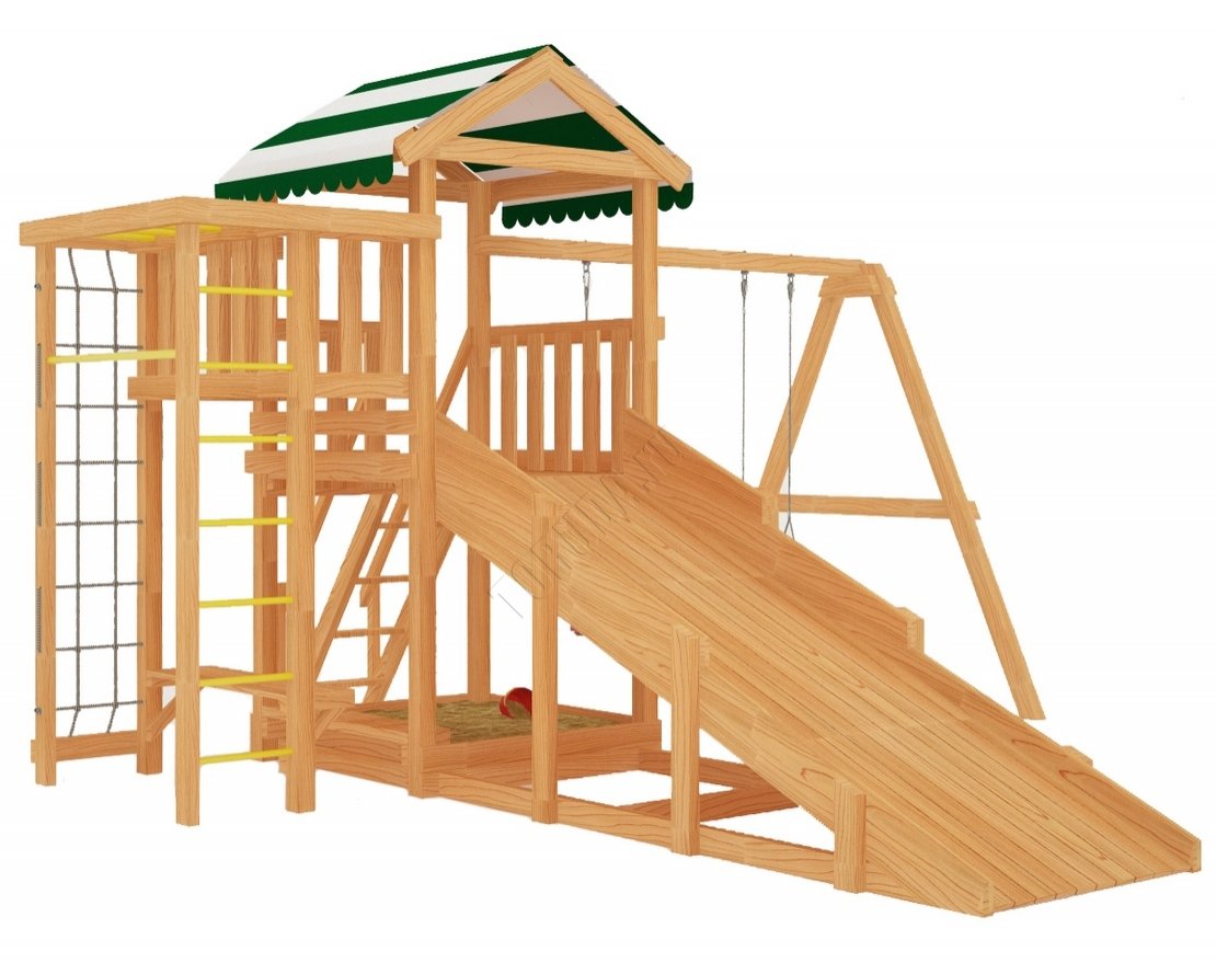 Площадка изготовлена из качественных материалов и соответствует всем стандартам безопасности. Каркас выполнен из натурального дерева — клеёного бруса квадратного сечения 75×75 мм, тщательно отшлифованного и закруглённого по краям, что исключает возможность получения заноз. Все крепежи надёжно скрыты под заглушками, обеспечивая безопасность детей.