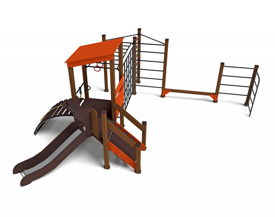 • В комплект входит: гимнастические кольца, турник, шведская стенка, рукоход, горка, скалодром, лестница