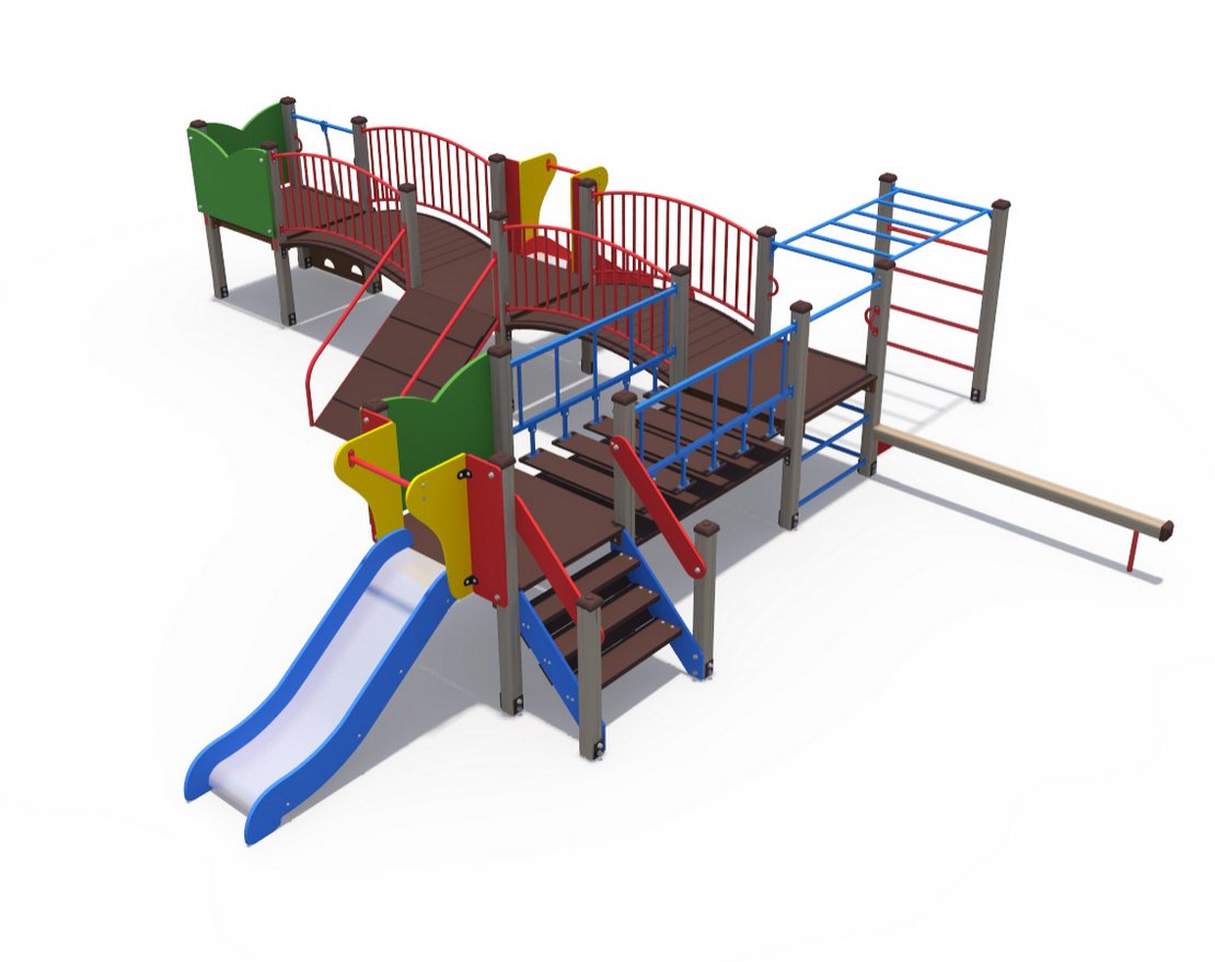 • В комплект входит: канат, шведская стенка, рукоход, горка, скалодром, лестница