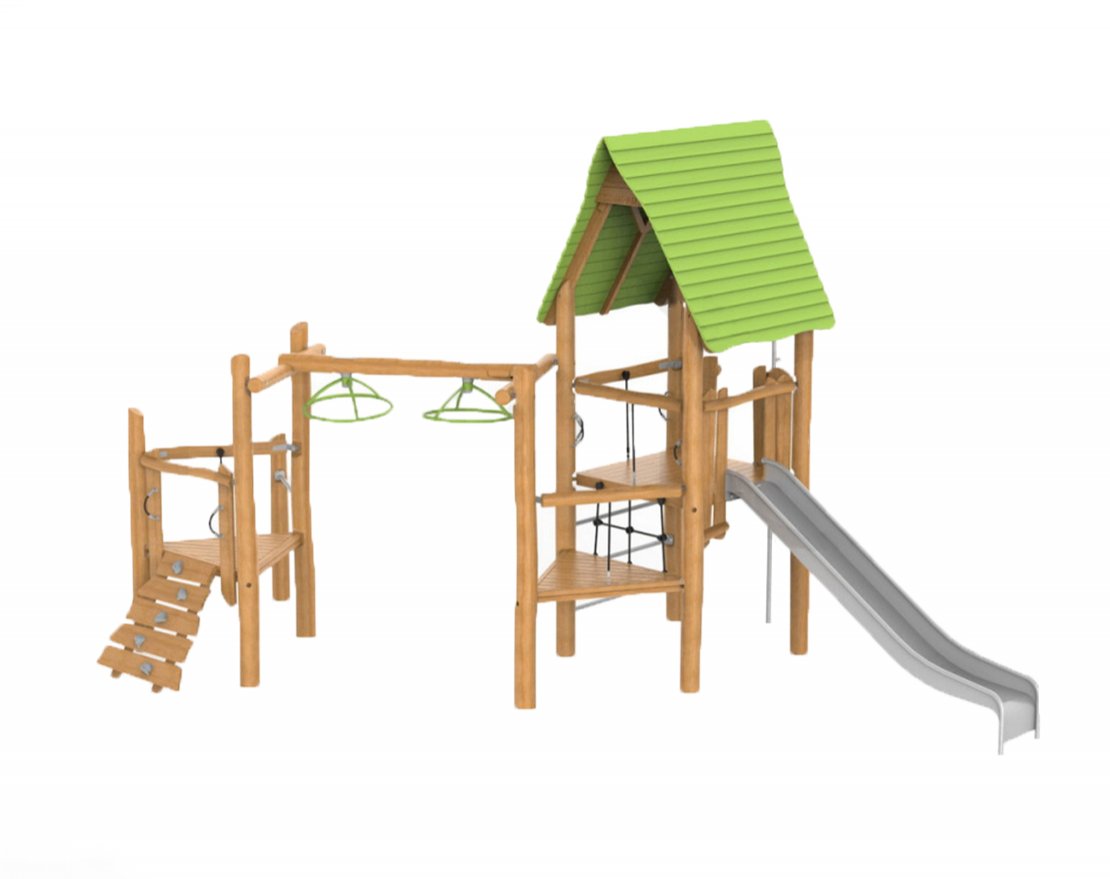 Комплекс изготовлен из высококачественных материалов: опоры — из натурального дерева, скат горки — из нержавеющей стали. Фурнитура выполнена из оцинкованной стали и оснащена пластиковыми заглушками для безопасности.