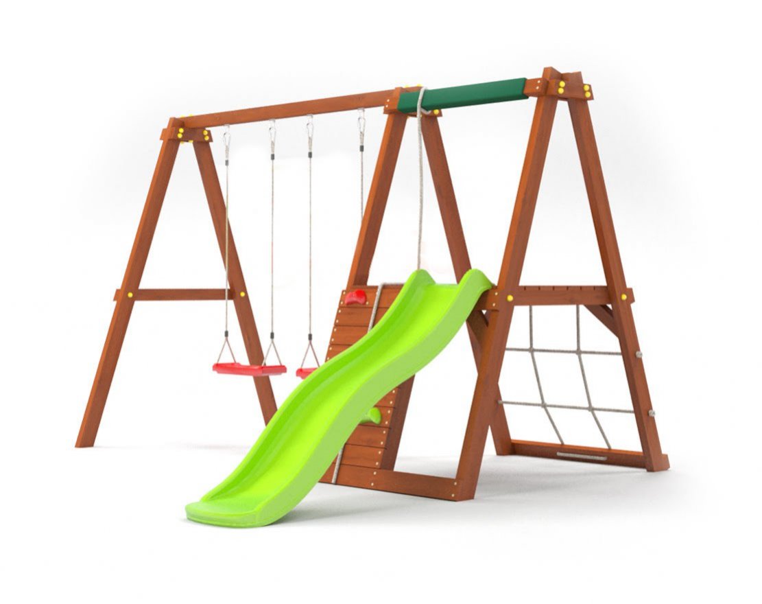 - Разнообразие элементов. В комплект входят горка, качели, сетка-лазалка и альпинистская стенка, а также платформа высотой 90 см.