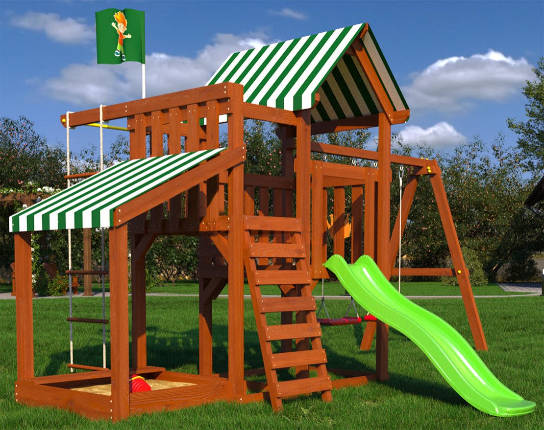 - В комплект входят: балкон с платформой высотой 1 200 мм; горка длиной 1 750 мм (цвет доступен на складе); игровой домик с крышей; качели «Лодочка» (2 шт.); гимнастические кольца; лестница; веревочная лестница; песочница; турник; лавочка для песочницы.