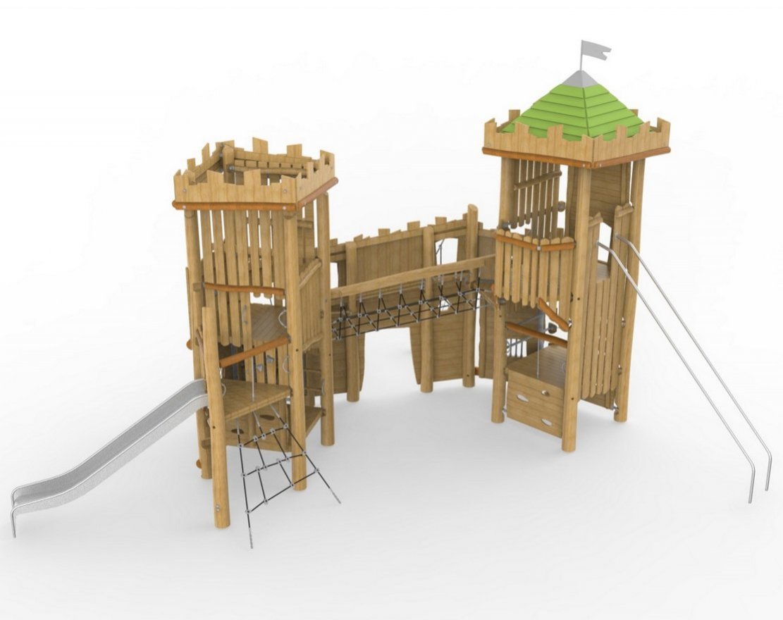 Игровой комплекс «Замок с крепостью» 892.05.02 — это сборно-разборная конструкция, которая предназначена для установки на детских площадках во дворах, в парках, в школах и детских садах. Изделие изготовлено из качественных материалов: