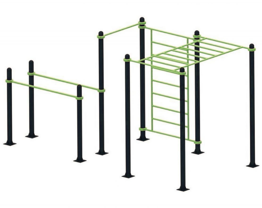 Ещё один важный элемент комплекса — брусья. Они позволяют выполнять как гимнастические элементы, так и простые упражнения, поддерживающие общий тонус организма. Брусья могут устанавливаться как в параллельном, так и в конусном варианте. Их длина составляет 175 см, диаметр — 4,2 см, а толщина стенок — 3.2 мм.