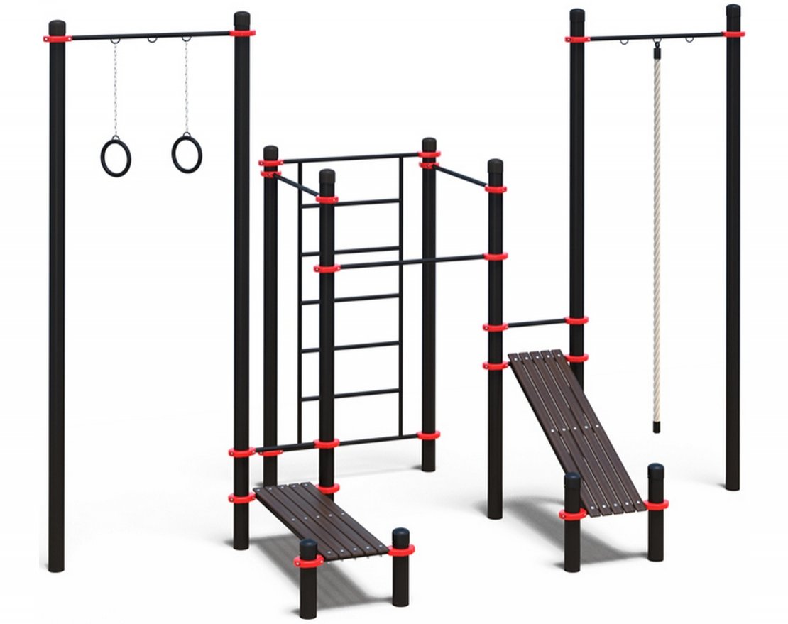 Комплекс предназначен для установки на открытом воздухе. Он станет отличным дополнением спортивной площадки или местом для тренировок во дворе.