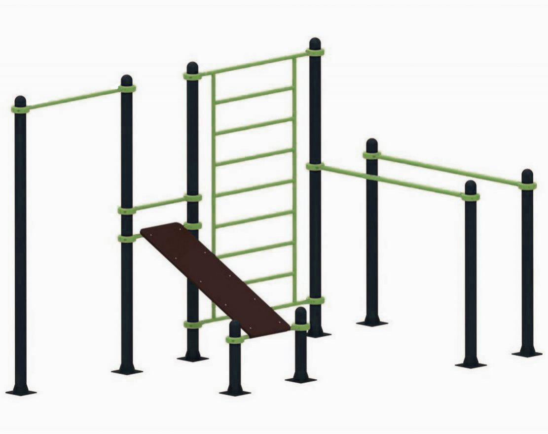 Уличный комплекс из брусьев, турника, шведской стенки и наклонной лавки для пресса TORUDA 70
