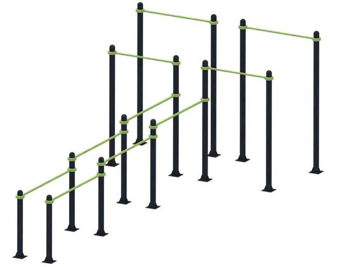 Элементы тренажёра изготовлены из прочной стали и регулируются по высоте при помощи хомутов. Порошковая краска обеспечивает долговечность покрытия и широкий выбор цветов по таблице RAL.