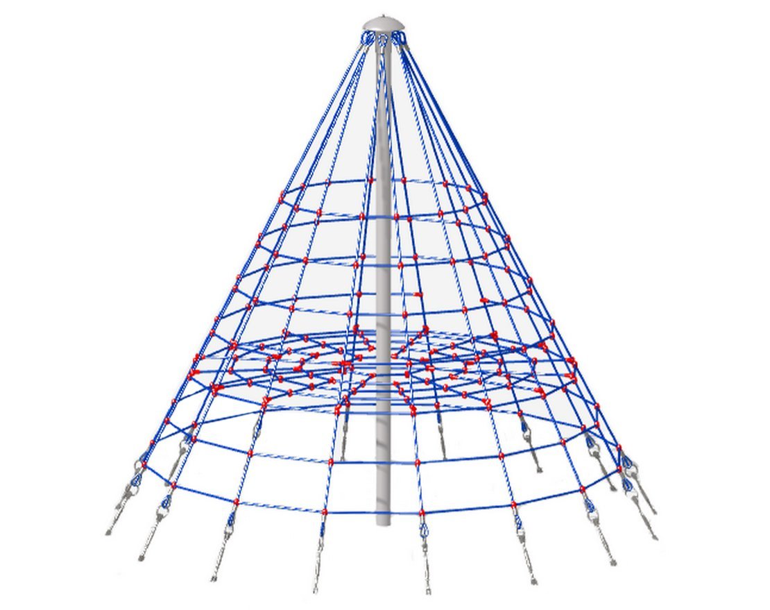 Для изготовления сетки используется армированный полипропиленовый 6-прядный канат Ø16 мм, Т- и Х-образные соединители, оцинкованные коуши, обжимные алюминиевые и стальные втулки. Х-образные соединители могут быть двух видов: «яйца» (изготовлены из полиамида или алюминиевого сплава) или s-образные крючки из нержавеющей стали. Сетка крепится к опорному столбу диаметром 133 мм при помощи хомутов, сверху на столб надевается металлическая вершина. Снизу («лучами») конструкция крепится к поверхности игровой площадки с помощью талрепов, которые обеспечивают необходимое натяжение.