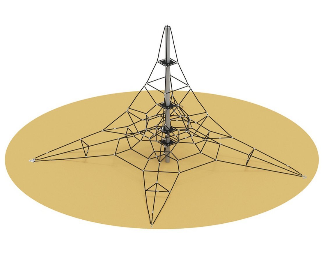 Для изготовления сетки используется армированный полипропиленовый канат, Х-образные и Т-образные соединители, оцинкованные и пластиковые коуши, обжимные стальные втулки. Х-образные соединители могут быть двух видов: «яйца» (изготовлены из полиамида или алюминиевого сплава) или s-образные крючки из нержавеющей стали — на ваш выбор. Сетка крепится к опорному столбу диаметром 108 мм при помощи стальных хомутов, покрытых порошковой краской, сверху на столб надевается металлическое навершие. С 4 сторон («лучами») конструкция крепится к поверхности игровой площадки с помощью талрепов, которые обеспечивают необходимое натяжение.
