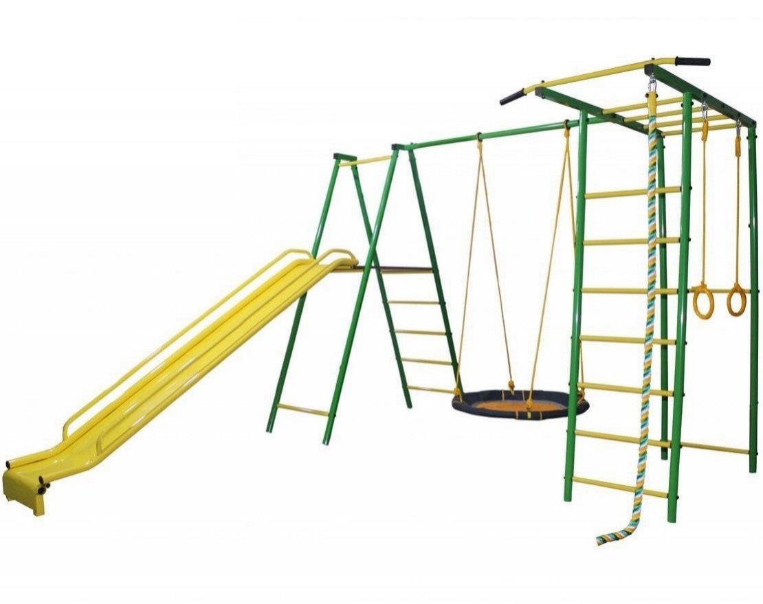 В комплектацию комплекса входят: канат, гимнастические кольца, качели «Облачко» и горка длиной 2,5 метра.