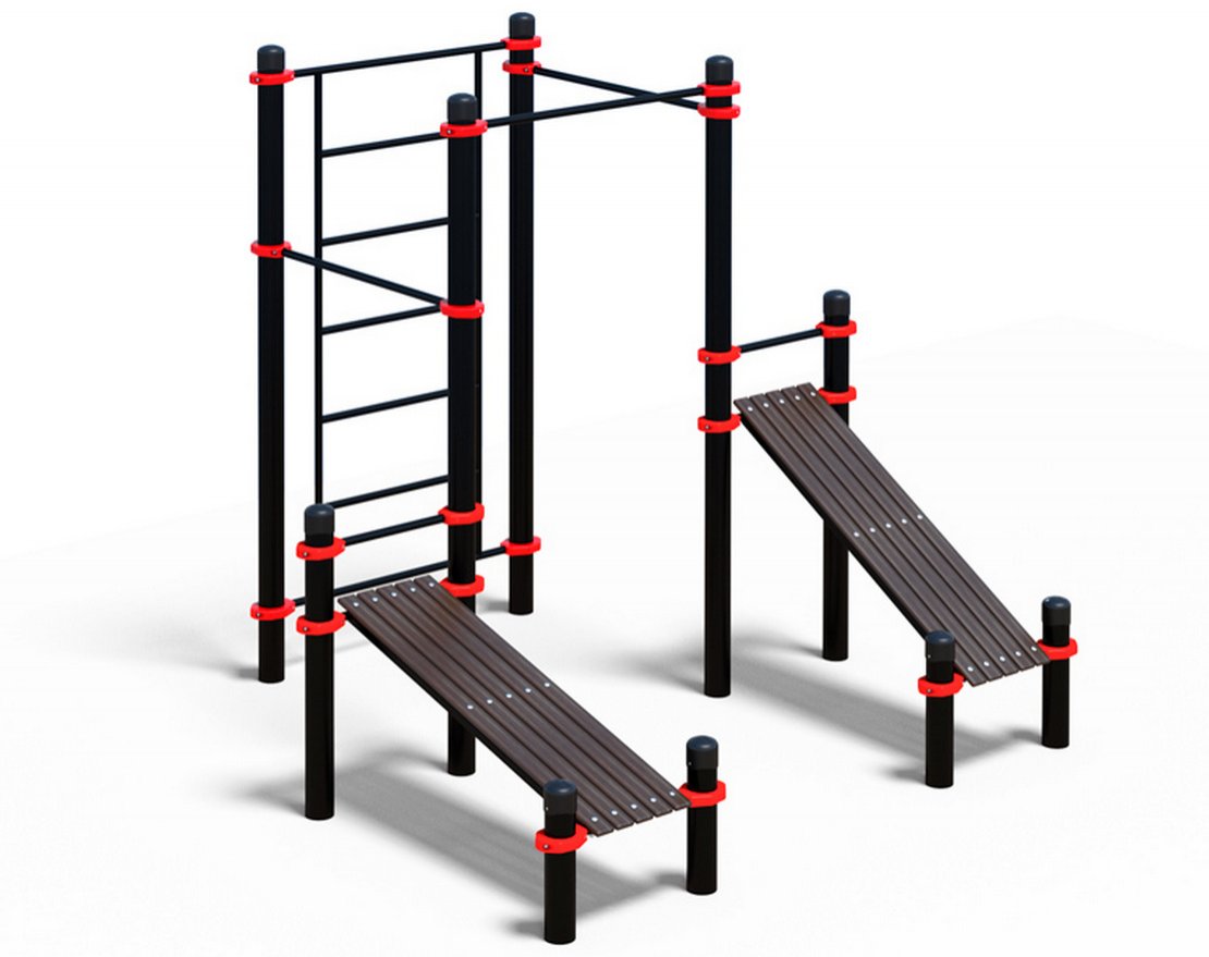 Комплекс представляет собой надёжную конструкцию из 10 опор-столбов из толстостенной трубы с порошковым покрытием длиной от 550 до 2 600 мм и включает в себя: