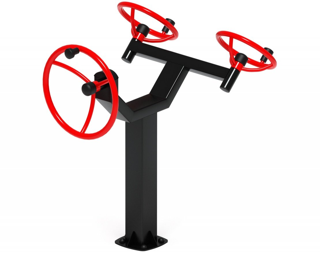 Уличный тренажёр выполнен в эффектном красном цвете с контрастными чёрными элементами. Он станет ярким акцентом на спортивной площадке и привлечёт внимание прохожих.