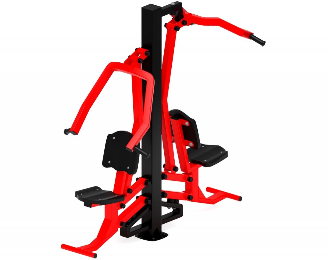 Все детали тренажёра выполнены из металла и имеют плавные закруглённые формы. Швы тщательно обработаны. Стальные элементы покрыты двойным порошковым окрашиванием, которое защищает от коррозии и сохраняет цвет при длительном воздействии атмосферных явлений. Пластиковые заглушки защищают резьбовые соединения и выступающие элементы от повреждений. Закладная деталь опорных стоек также имеет двойное порошковое покрытие.