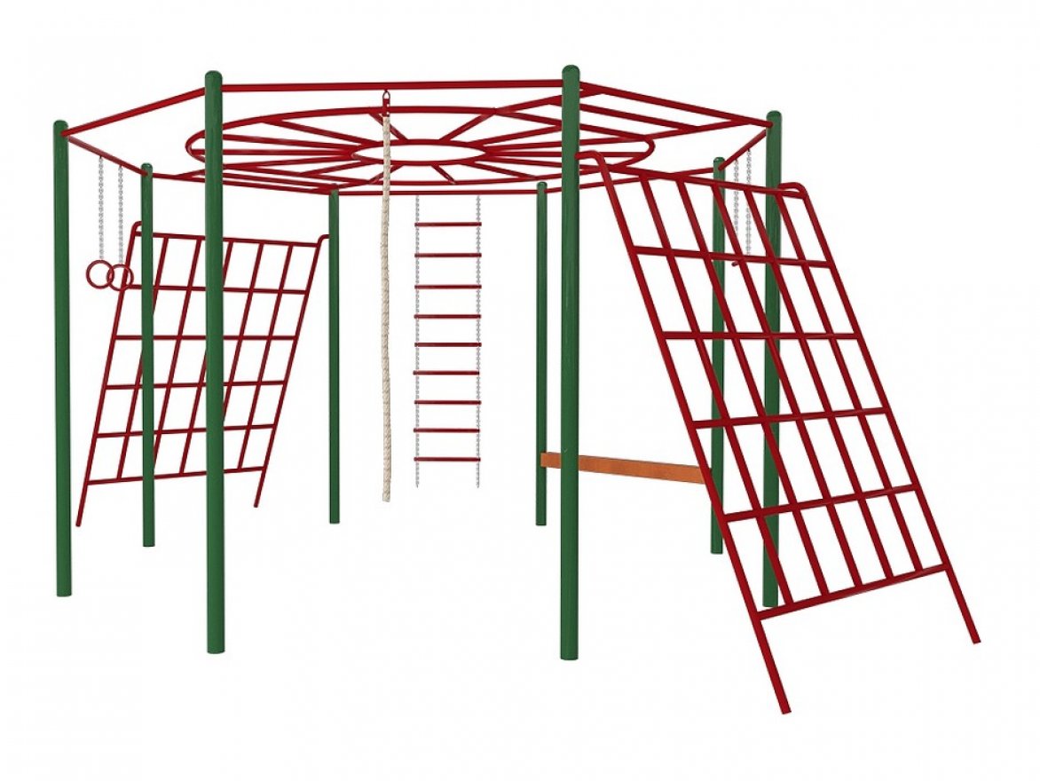 Комплекс изготовлен из прочной металлической трубы с защитным полимерным покрытием, устойчивым к погодным воздействиям и ультрафиолетовым лучам. В комплект входят гимнастические кольца, канат, перекладина на цепи, лестница и бревно, которые надёжно скреплены металлическими хомутами.