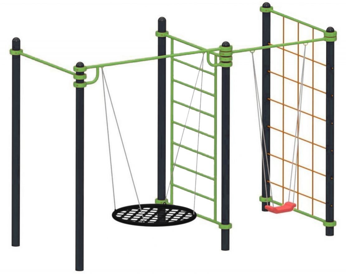 Элементы комплекса регулируются с помощью хомутов, что позволяет изменять высоту и расположение элементов в зависимости от потребностей пользователя. Это делает комплекс подходящим для людей разных возрастов и уровней физической подготовки.