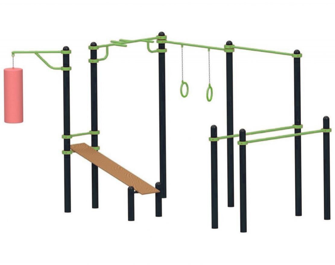 Элементы комплекса изготовлены из прочной стали и регулируются по высоте при помощи хомутов. Это позволяет настроить комплекс под рост каждого пользователя. Кроме того, благодаря круглым трубам и хомутам можно менять расположение элементов в пространстве.