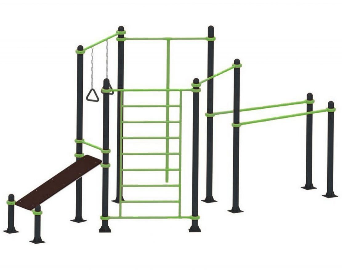 Элементы комплекса регулируются по высоте. Это позволяет адаптировать площадку под потребности пользователей разного роста и уровня подготовки.